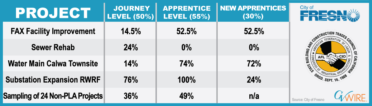 In an annual presentation to the Fresno City Council, Public Works Director Scott Mozier reviewed the hiring numbers for active PLA projects. The goal where “unions agreed to exert their utmost efforts,” the staff report said, was to hire at least 50% locals for journey-level projects; 55% locals for apprentice-level projects; and 30% by new local apprentices.
