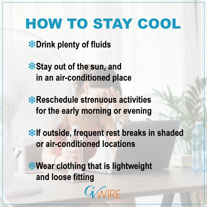 In general, health officials say staying indoors, seeking air-conditioned buildings, and drinking more water than usual can stave off heat-related illnesses. Caffeine and alcohol are no-nos. Eating smaller meals more often throughout the day can help.