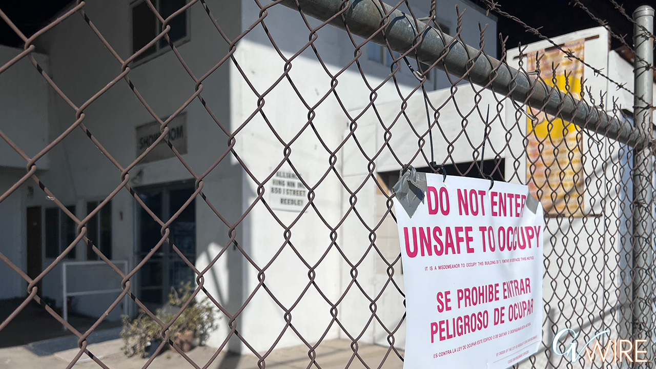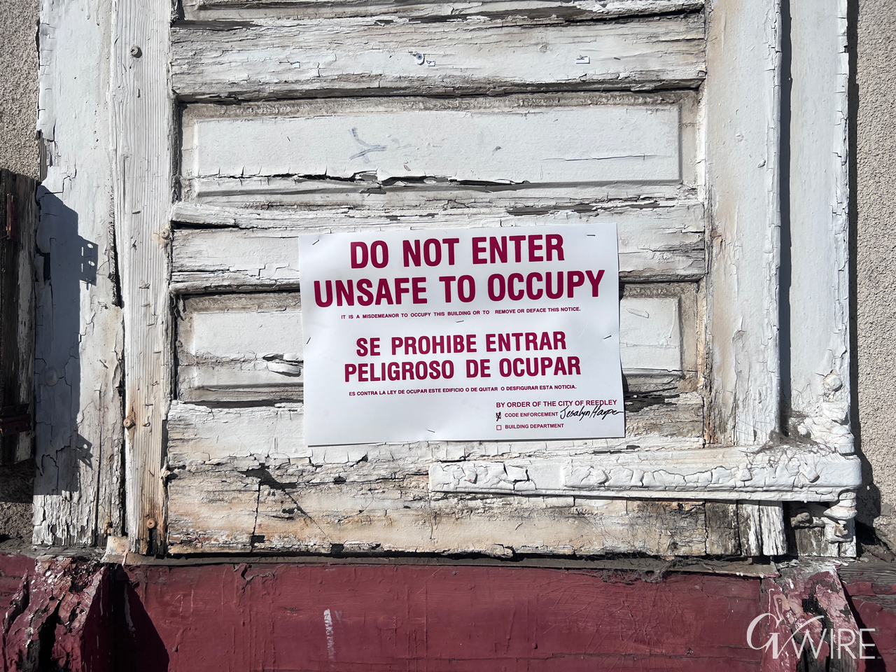 One of several “Do Not Enter Unsafe to Occupy” signs posted by Jesalyn Harper of the Reedley Fire Department on the building at 850 I Street. (GV Wire/Paul Marshall)
