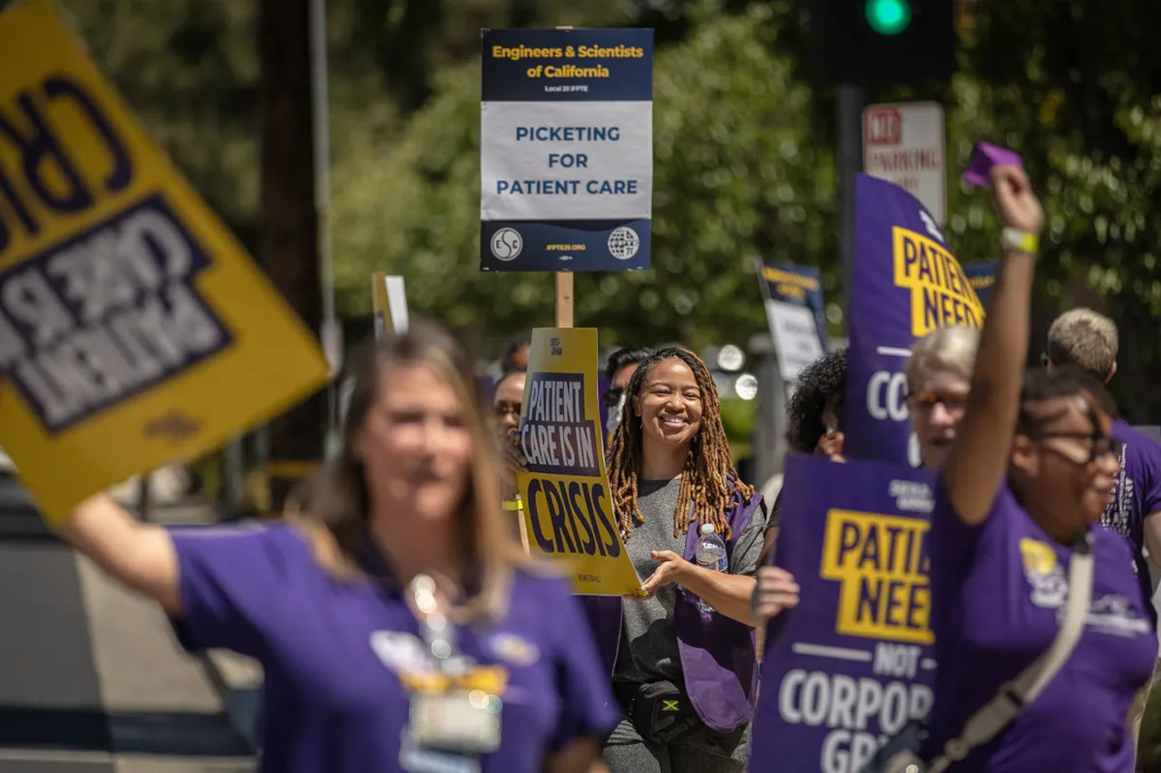 Kaiser Permanente health care workers strike outside a Kaiser facility in Sacramento on July 25, 2023. Workers are on the picket lines to protest patient care crisis and unsafe staffing at Kaiser hospitals. (CalMatters/Rahul Lal)