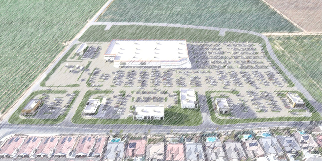 The project description also calls for a car wash, drug store, additional retail, and restaurants. In the second phase, a more neighborhood-focused shopping center at Akers Street and Avenue 320 would provide retail, services, and restaurants on 6.4 acres.