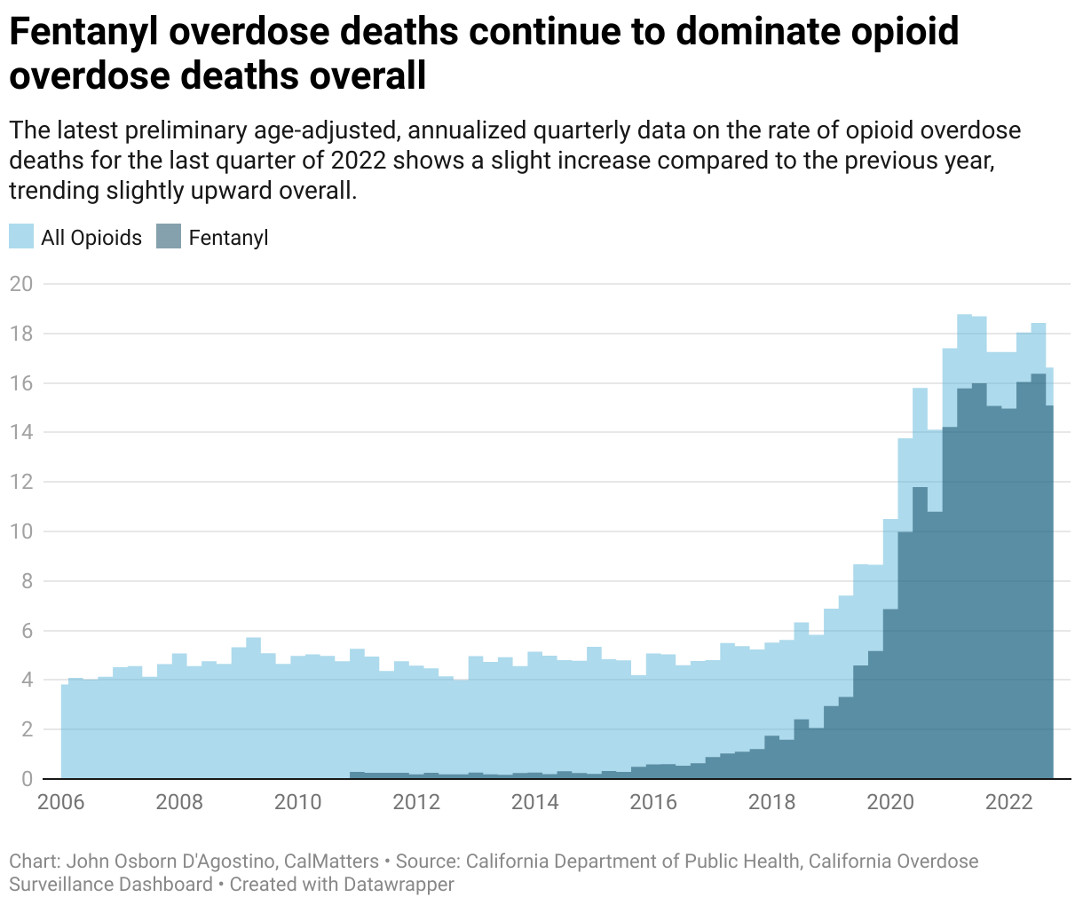 Another public health crisis, fentanyl overdoses, drove impassioned discussions in this year’s legislative session as lawmakers tried to address this latest phase of the opioid epidemic. Last year, 6,959 people died from an opioid overdose — a 115% jump from 2019, according to the California Department of Public Health. Much of the growth has been linked to fentanyl, which is known to be 50 times stronger than heroin and 100 times stronger than morphine.