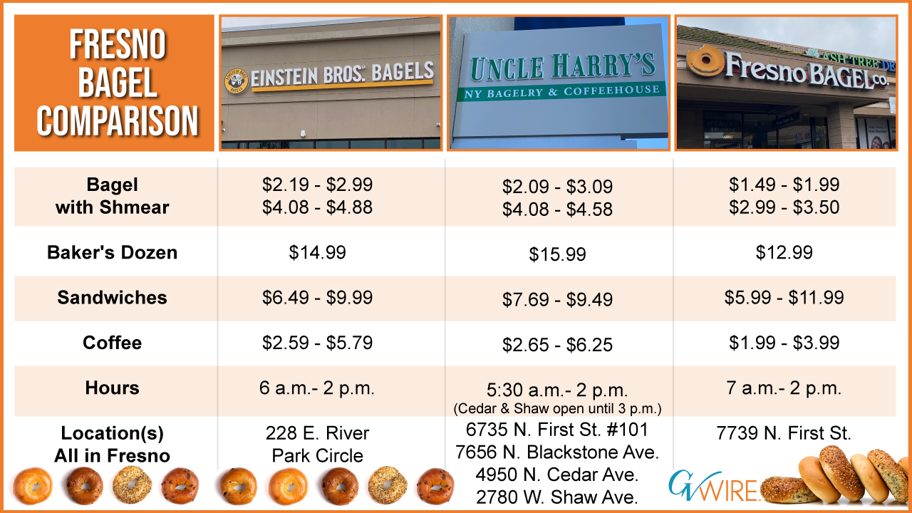 National chains in Fresno have come up bagels. The only dedicated purveyors of the doughy treat in town have been Fresno Bagel Co. (8839 N. First Street, at Nees Avenue), and four Uncle Harry’s NY Bagelry & Coffeehouse locations.