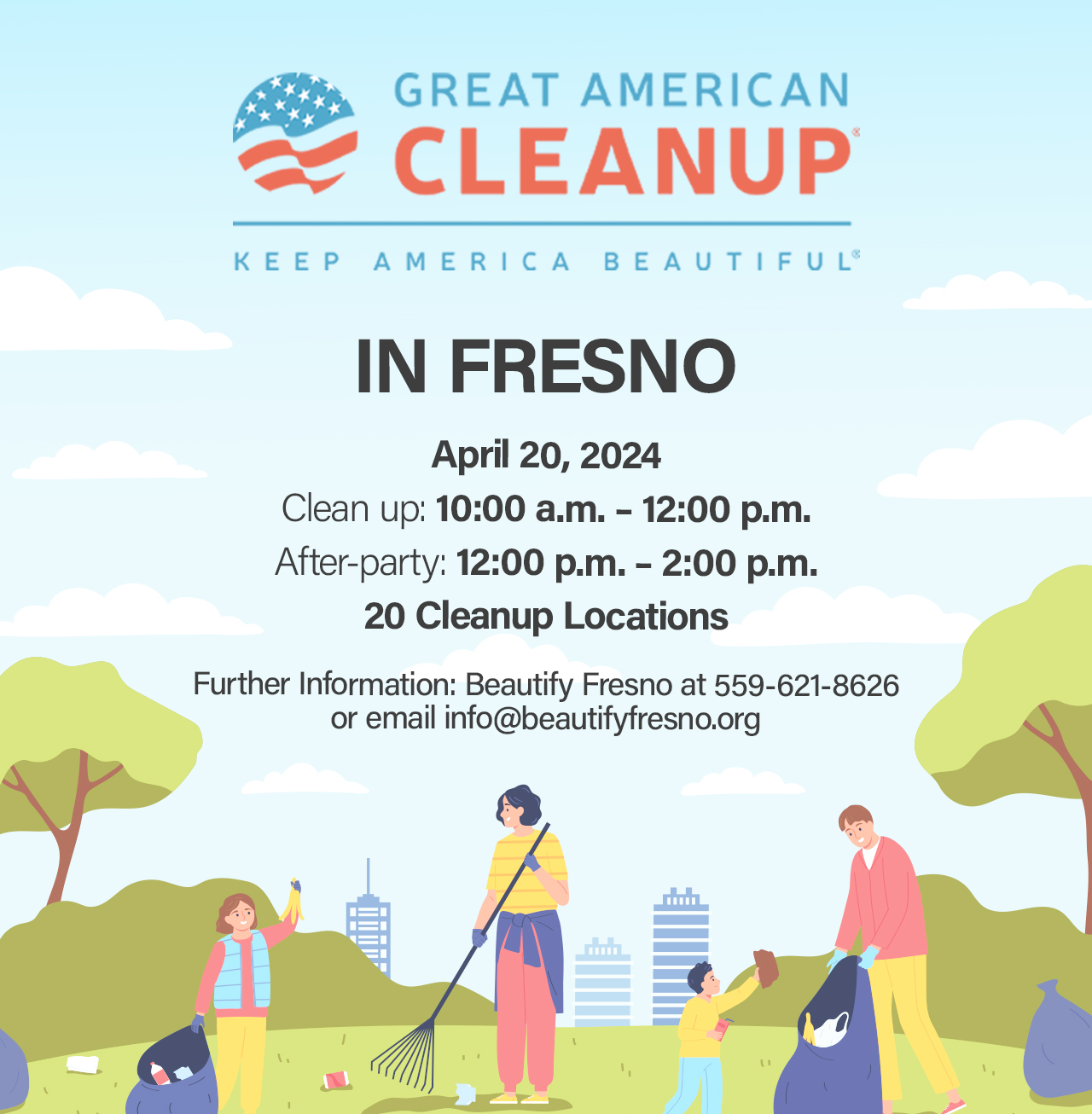 For questions and information about the 2024 Great American Cleanup, contact Beautify Fresno at 559-621-8626 or email info@beautifyfresno.org.