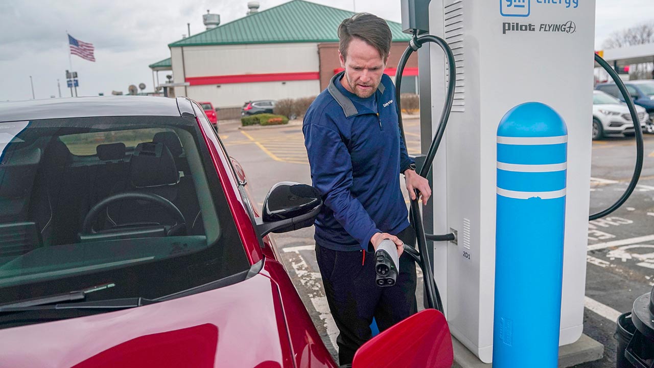 About 175 miles (282 kilometers) into his journey, he stopped at a new public charging station at the Pilot Travel Center along Interstate 70 outside Columbus, Ohio. The station, which opened in London, Ohio, in December with four chargers, can power an EV in about half an hour while drivers buy food and drinks and use amenities.
