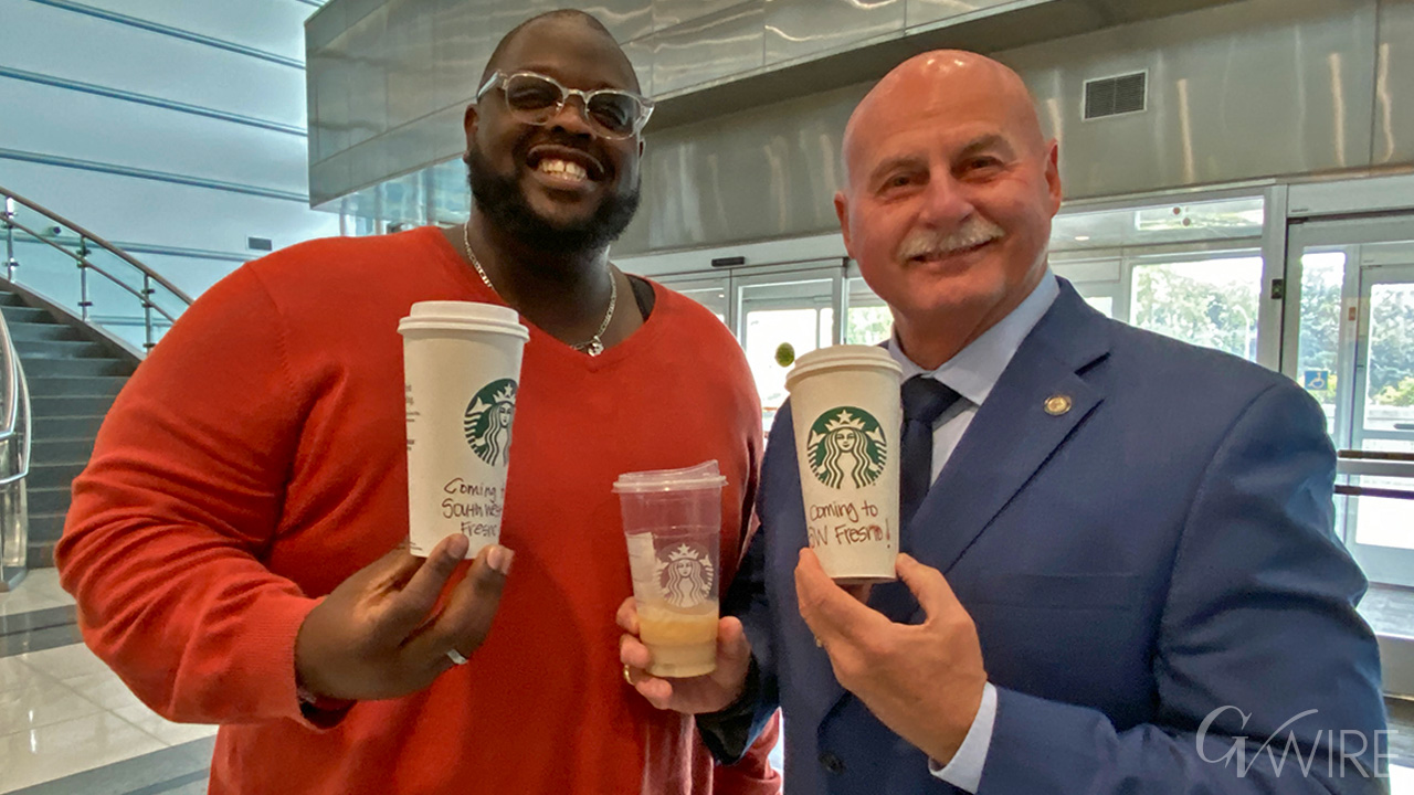 Pastor DJ Criner (left) and Fresno Mayor Jerry Dyer celebrate city council approval of a new southwest Fresno Starbucks. (GV Wire/David Taub)
