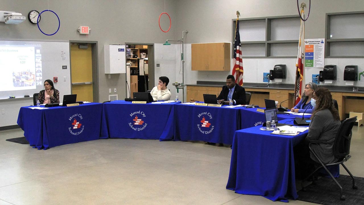 Members of the Merced City Schools Board of Trustees are shown during a March 2024 meeting. (The Merced Focus/Christian De Jesus Betancourt )