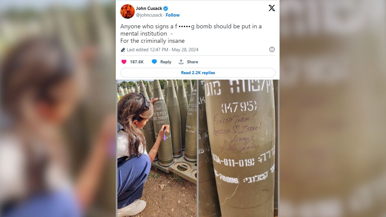 Actor John Cusack slammed former Republican presidential candidate Nikki Haley after she tweeted herself signing Israeli artillery shells, Newsweek reports.