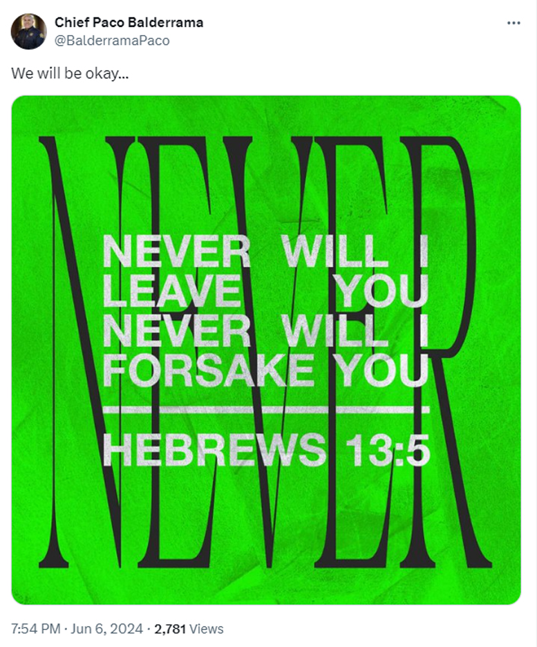 Quoting Hebrews 13:5, Balderrama posted “Never will I leave you. Never will I forsake you.” His post also included “We will be okay…”