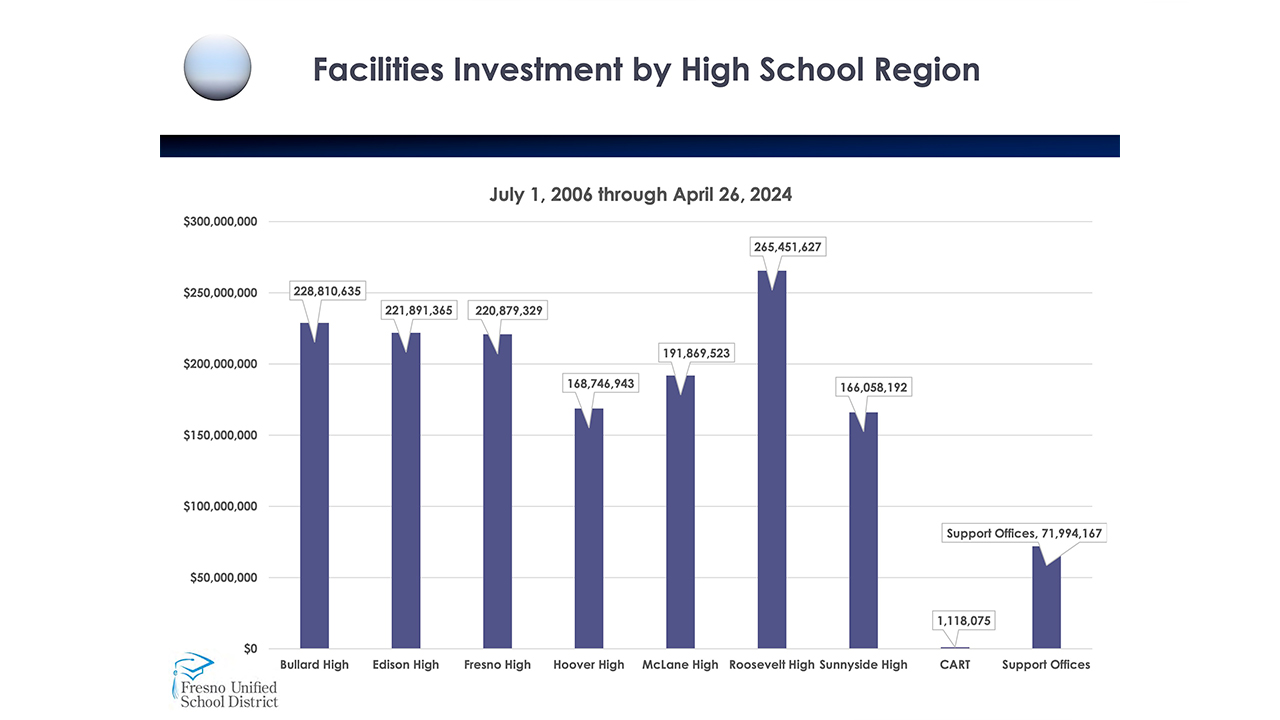 Roosevelt High School, one of the city’s older high schools, led the way with $265,451,627 in facilities spending, followed by Bullard High with $228,810,635, Edison High with $221,891,365, and Fresno High with $220,879,329.