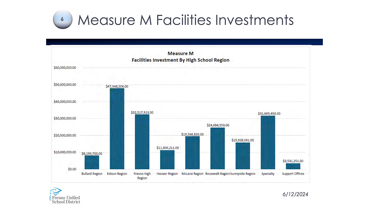 But the Measure M spending pattern has been more lopsided: Edison was the big winner, with $47,948,504, followed by Fresno High with $32,517,913, and “Specialty” with $31,669,493. Altogether, the investments through Measure M for the high school regions, “Specialty,” and support offices have totaled $195,254,545, the district reported. Measure M is a $325 million bond measure that voters approved in 2020.
