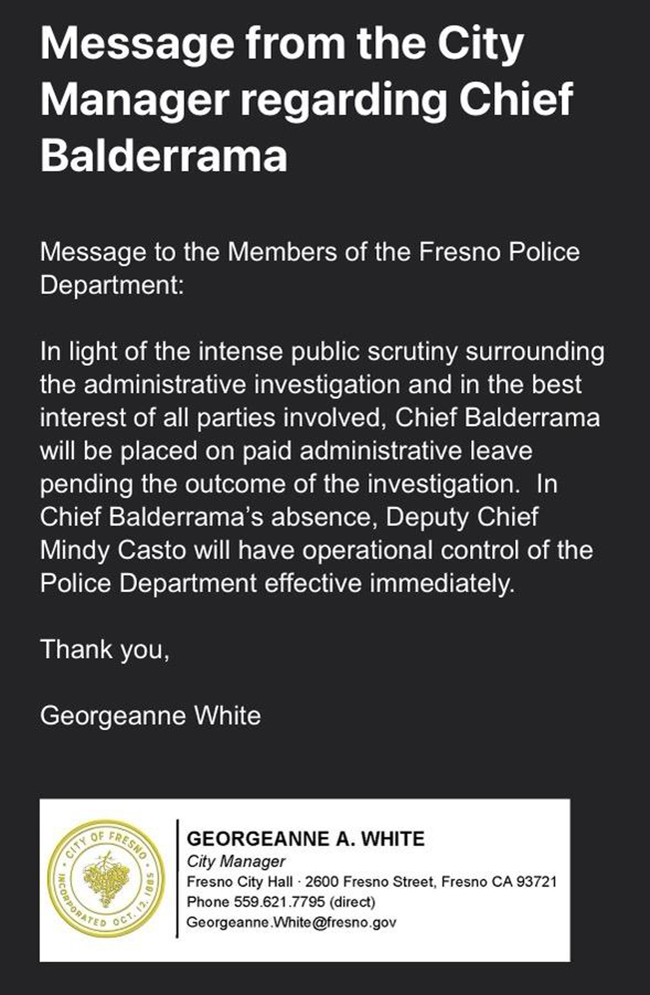 In an email message to its members, the Fresno Police Officers Association’s executive board said that it “agrees with the city placing Chief Balderrama on paid administrative leave pending the conclusion of their investigation” and that it “is in the best interest of all parties involved.”