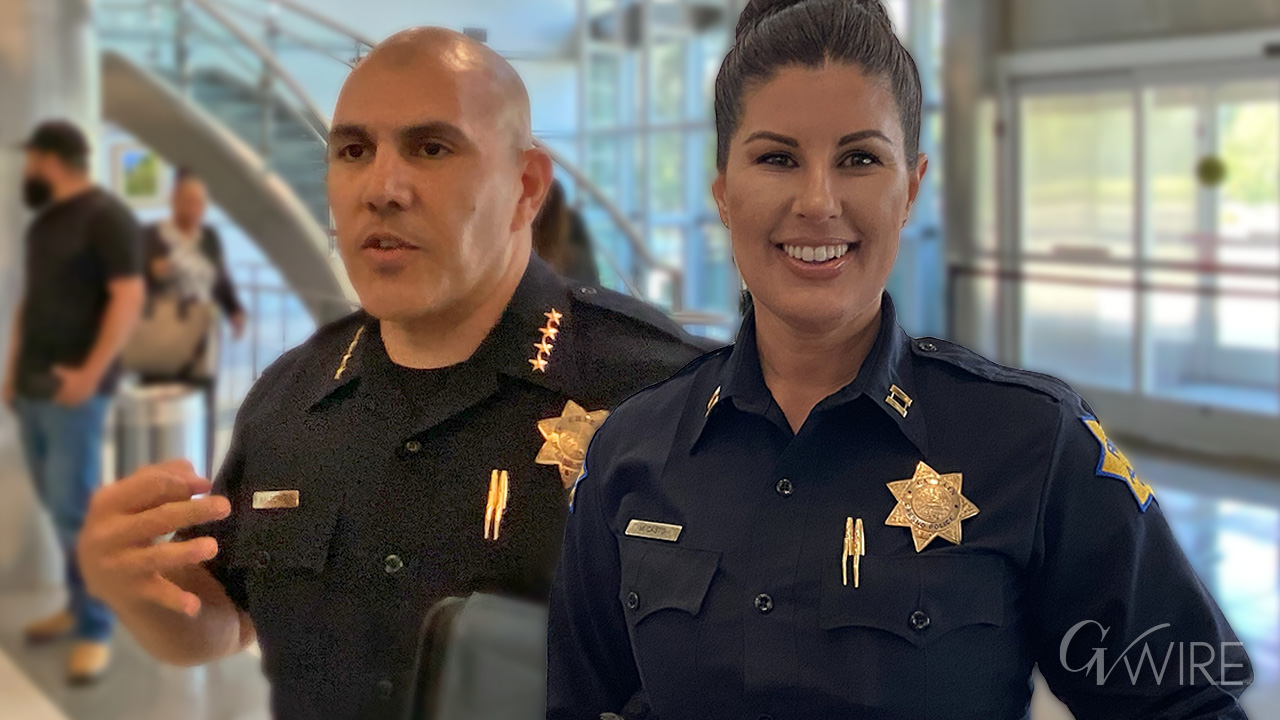 While Fresno Police Chief Paco Balderrama, left, is on paid administrative leave, Deputy Chief MIndy Casto will take the helm. (GV Wire Composite/Paul Marshall)
