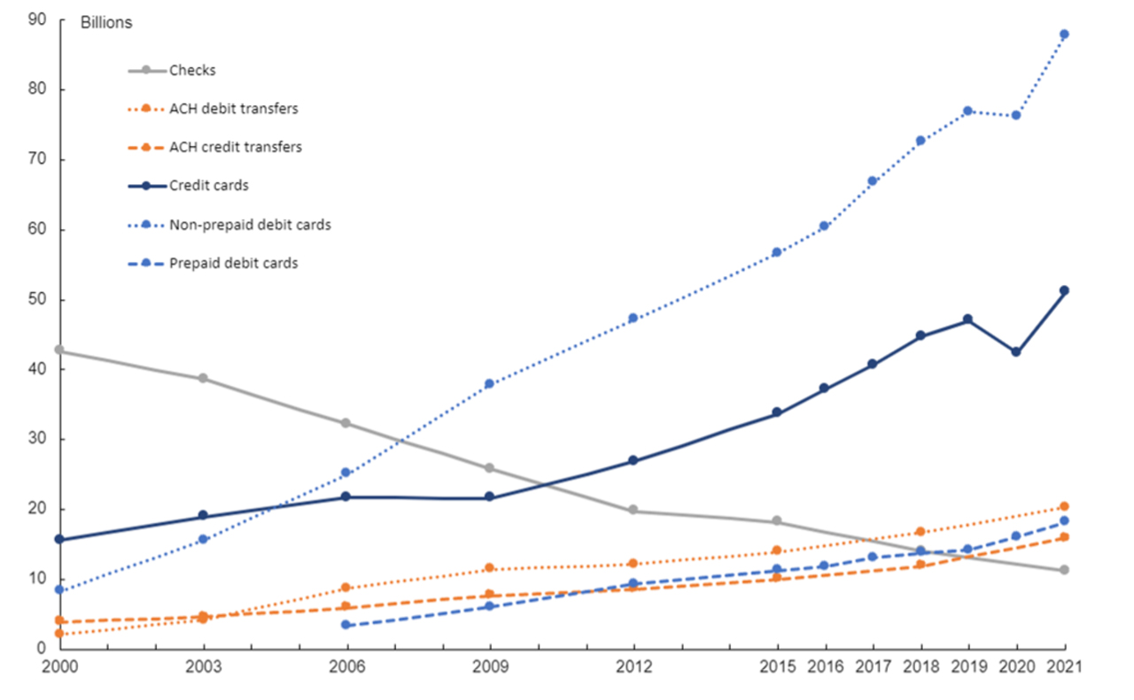 Conversely, credit card and debit card payments have filled the gap left by checks and cash. From 101.5 billion card transactions in 2015, people used cards to pay for things 157 billion times in 2021.