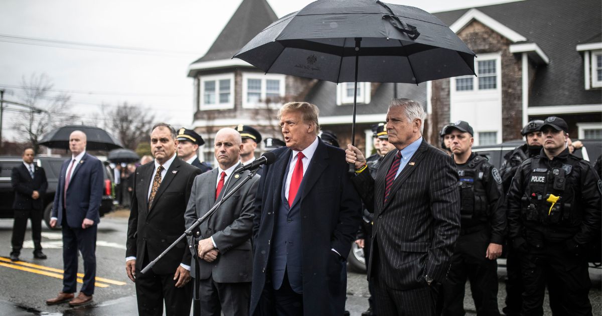 Bruce Blakeman, the Nassau County executive, holds an umbrella over former President Donald Trump as Trump speaks in Massapequa Park, N.Y., March 28, 2024. Blakeman is recruiting “special deputies” to deploy during disaster or unrest. Opponents say the move is dangerous. (Dave Sanders/The New York Times)