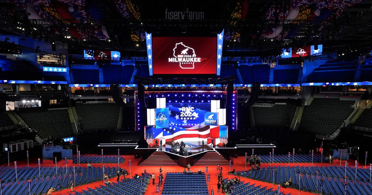 A general view during rehearsals at the 2024 Republican National Convention at the Fiserv Forum, Sunday, July 14, 2024, in Milwaukee. (AP/Paul Sancya)