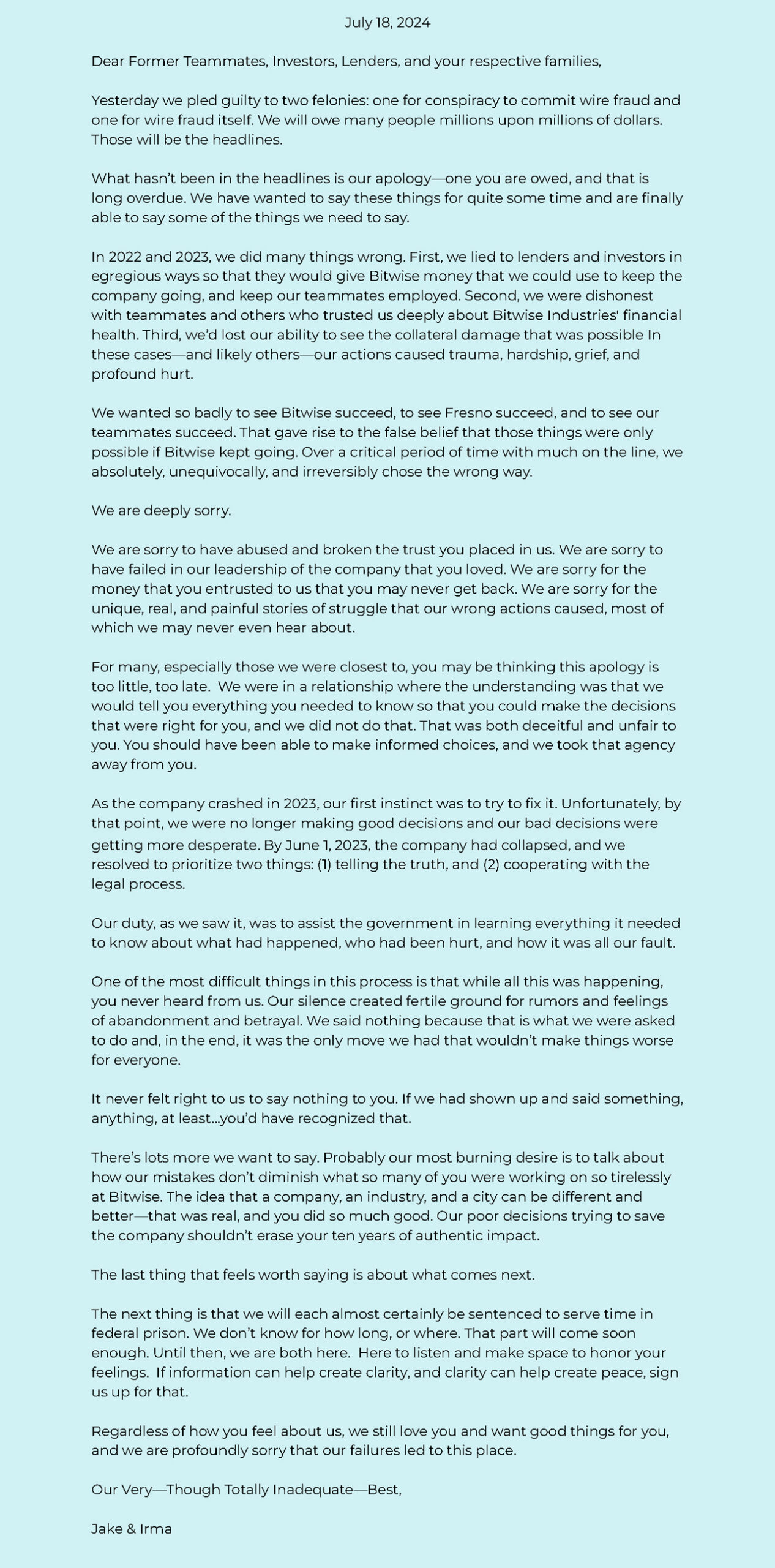 - Criminally guilty former Bitwise CEOs Irma Olguin Jr. and Jake Soberal issue an apology.