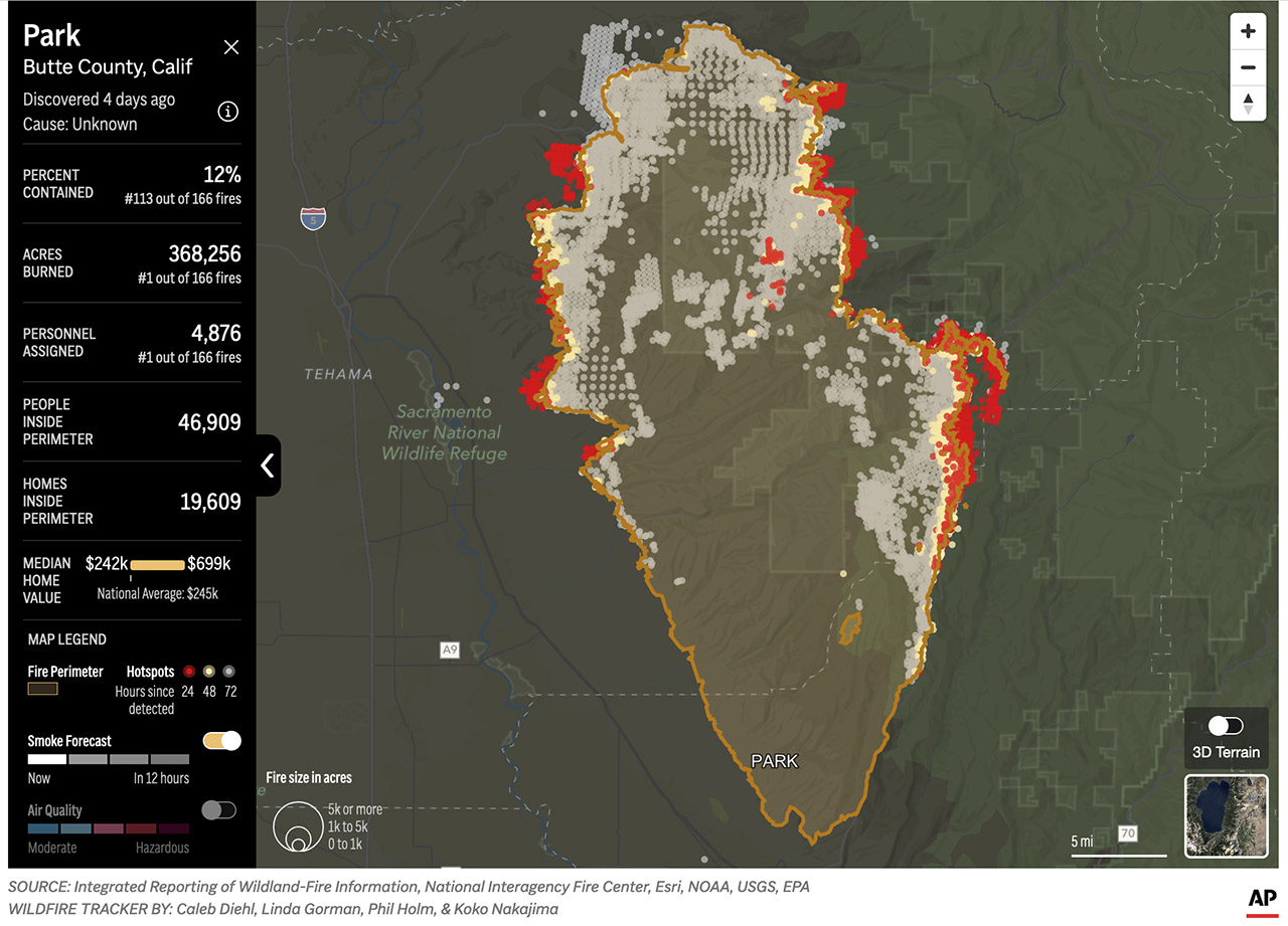 - Park Fire, California's largest this year, scorches over 575 square miles and threatens thousands of structures.