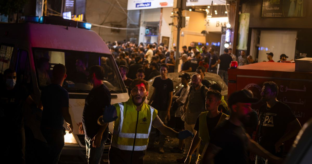 Rescue workers and security personnel work to secure the scene of an Israeli airstrike at a residential building in the southern suburbs of Beirut, early on Wednesday, July 31, 2024. Israel carried out a strike in the suburbs of Beirut, on Tuesday night, saying that it had targeted Fuad Shukr, a senior Hezbollah official, whom it blamed for an assault that killed 12 children and teenagers in the Israeli-controlled Golan Heights this weekend. (Diego Ibarra Sanchez/The New York Times)