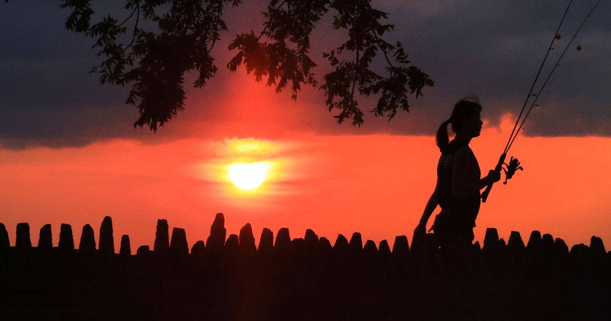 A person walks with fishing gear as the sun is obscured from the wildfires in the western United States and Canada in Oconomowoc, Wis. Saturday, Aug. 3, 2024. (John Hart/Wisconsin State Journal via AP)