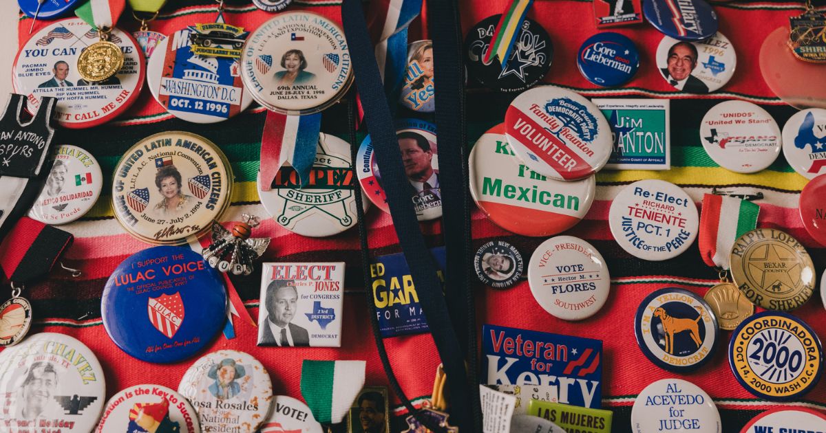 Campaign pins at the home of Lidia Martinez, an 87-year-old retired educator whose home was raided on Tuesday, Aug. 20, in San Antonio, Aug. 25, 2024. A Latino civil rights group is asking the Department of Justice to open an investigation into a series of raids conducted on Latino voting activists and political operatives as part of a sprawling voter fraud inquiry by the Texas attorney general, Ken Paxton. (Christopher Lee/The New York Times)