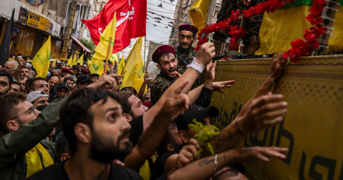 Hezbollah supporters during the funeral of Ibrahim Aqeel, a senior Hezbollah commander, after he was killed in an Israeli airstrike, in Beirut on Sunday, Sept. 22, 2024. (Diego Ibarra Sánchez/The New York Times)
