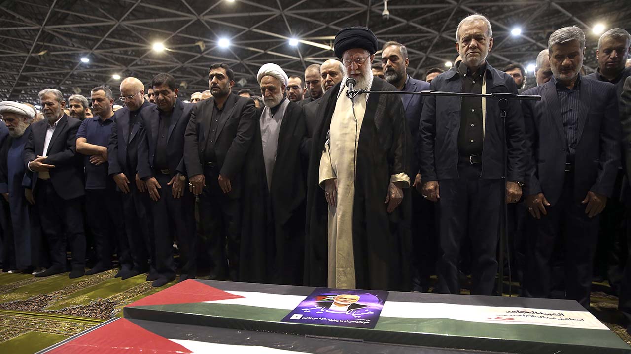 In this photo released by the official website of the office of the Iranian supreme leader, Supreme Leader Ayatollah Ali Khamenei, third right, leads a prayer over the coffins of Hamas leader Ismail Haniyeh and his bodyguard who were killed in an assassination blamed on Israel on Wednesday, during their funeral ceremony at the Tehran University campus, in Tehran, Iran, Thursday, Aug. 1, 2024. Iranian President Masoud Pezeshkian prays at second right. (Office of the Iranian Supreme Leader via AP)