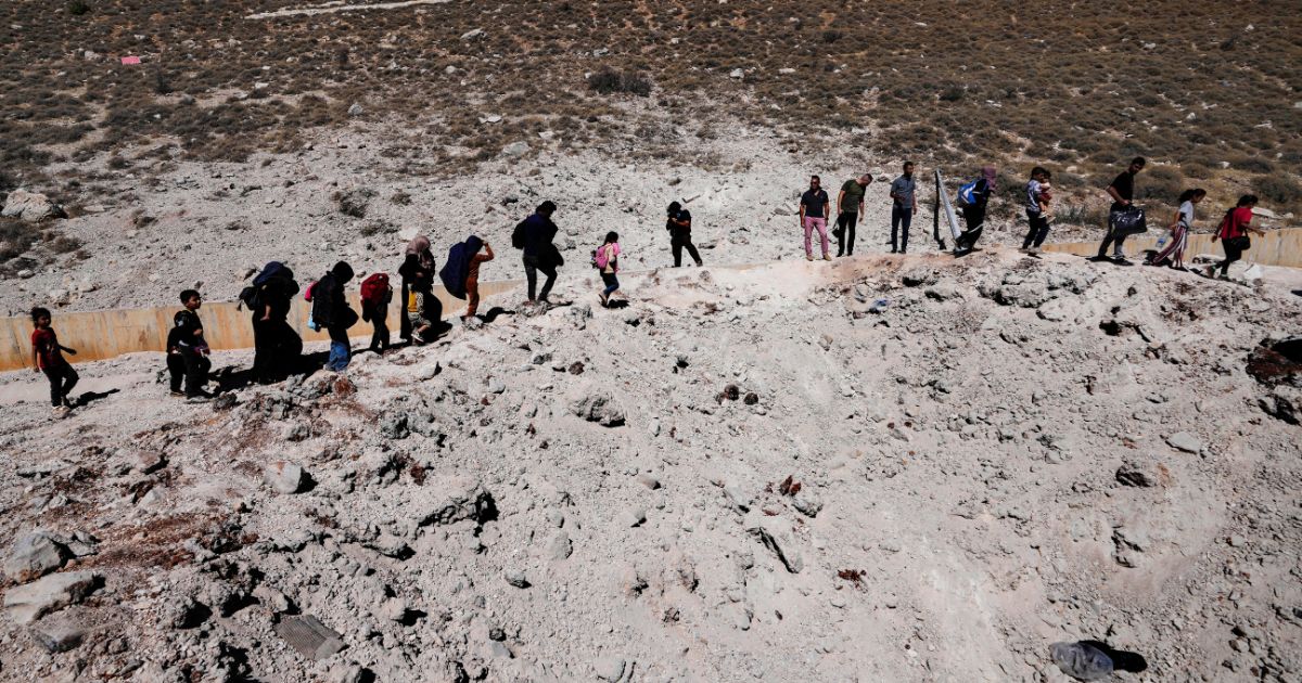 People carry their luggage as they cross into Syria on foot, through a crater caused by Israeli airstrikes aiming to block Beirut-Damascus highway at the Masnaa crossing, in the eastern Bekaa Valley, Lebanon, Saturday, Oct. 5, 2024. (AP/Hassan Ammar)