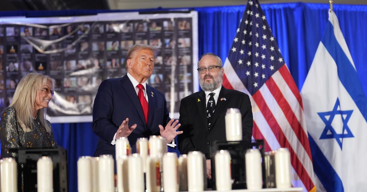 Before Trump’s remarks, a rabbi led a ceremony in which a number of Jewish leaders and elected officials lit memorial candles and delivered remarks to honor the more than 1,200 people killed when Hamas attacked Israel last year. Event organizers left a section of chairs empty on either side of the stage with photos of hostages who remain in the Gaza Strip, a statement about their continued captivity.