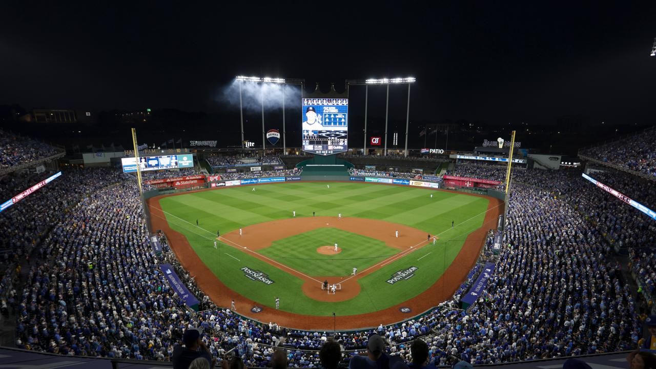The New York Yankees and Kansas City Royals play in Game 4 of an American League Division baseball playoff series as seen in this general view of Kauffman Stadium Thursday, Oct. 10, 2024, in Kansas City, Mo. (AP Photo/Colin Braley)