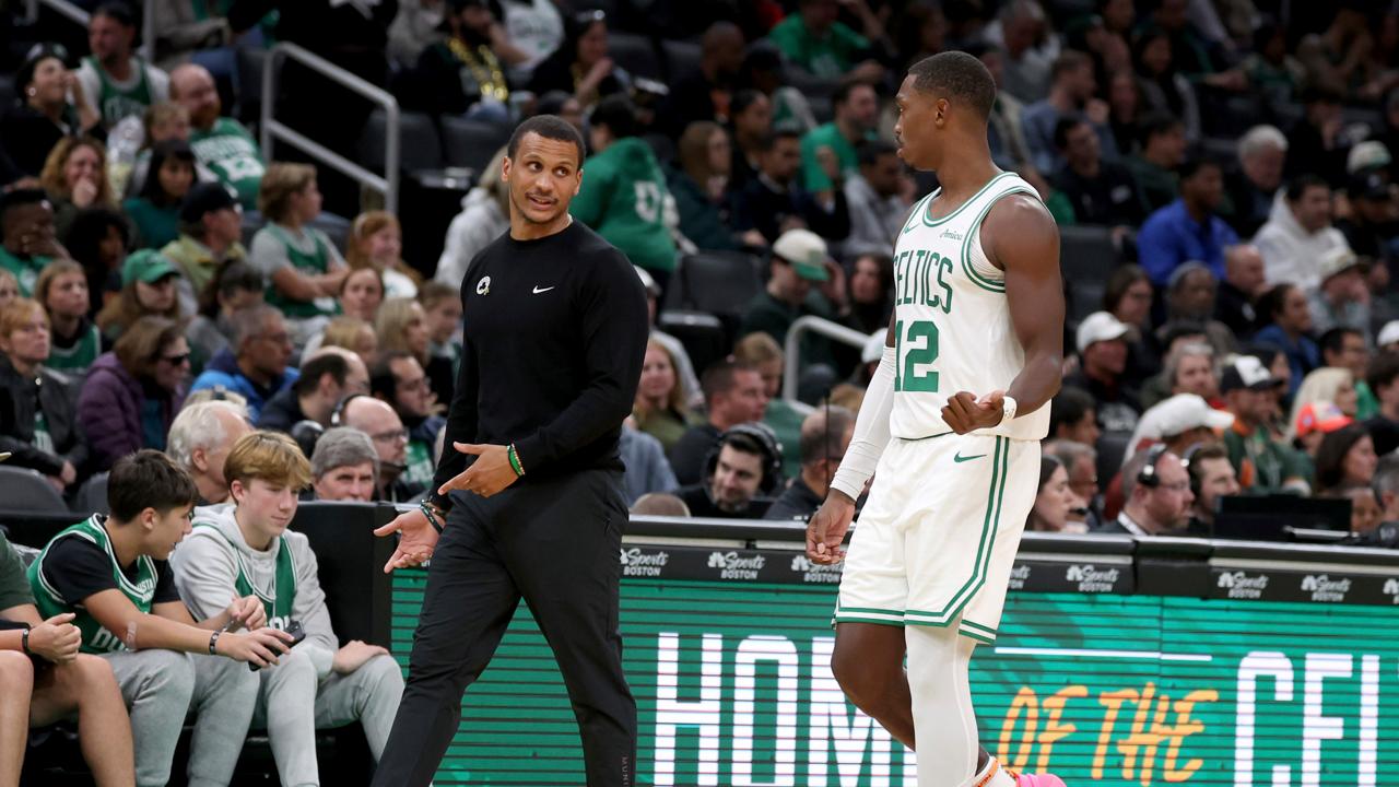 Boston Celtics head coach Joe Mazzulla, front left, speaks with Celtics guard Lonnie Walker IV (12) who walks to the team bench during the second half of a preseason NBA game against the Toronto Raptors, Sunday, Oct. 13, 2024, in Boston. (AP/Mark Stockwell)