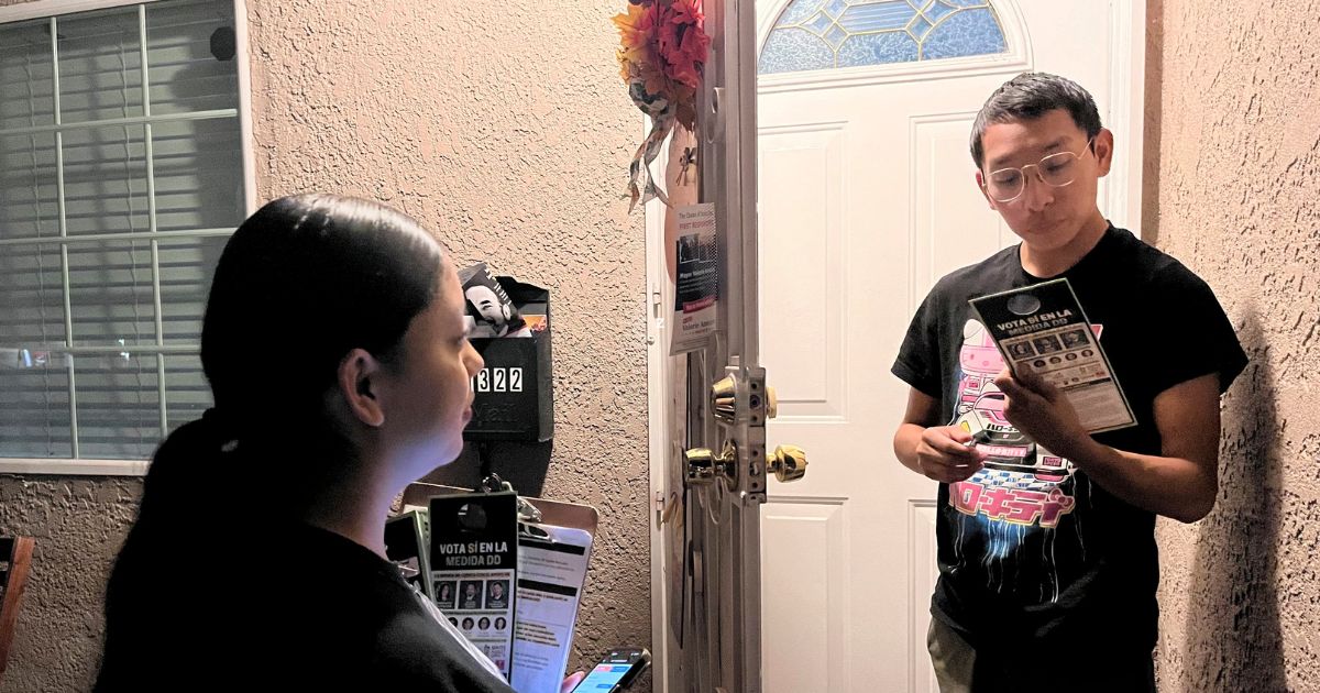 Genesis Lopez, 21, speaks with Santa Ana, Calif. resident Eduardo Entimio, 23, on Wednesday, Oct. 23, 2024, about Measure DD, which would allow noncitizens to vote in local elections. (AP/Jaimie Ding)