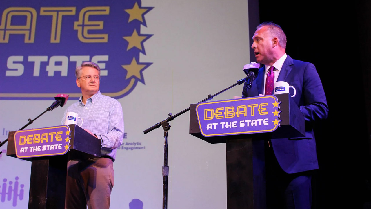 Congressman John Duarte, left, is shown debating Adam Gray during the "Debate at the State" at Modesto's State Theatre on Friday, Oct. 25. 2024. (KVPR/Rachel Livinal)