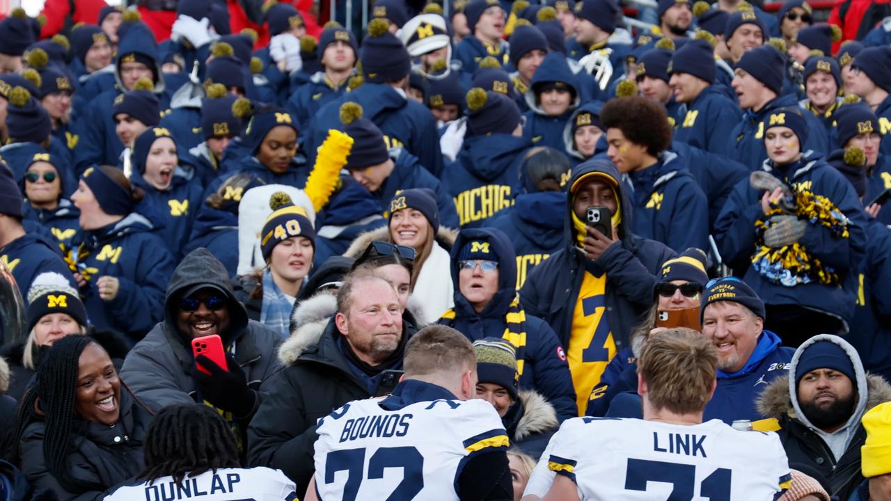 Michigan players celebrate their win over Ohio State in an NCAA college football game Saturday, Nov. 30, 2024, in Columbus, Ohio. (AP/Jay LaPrete)