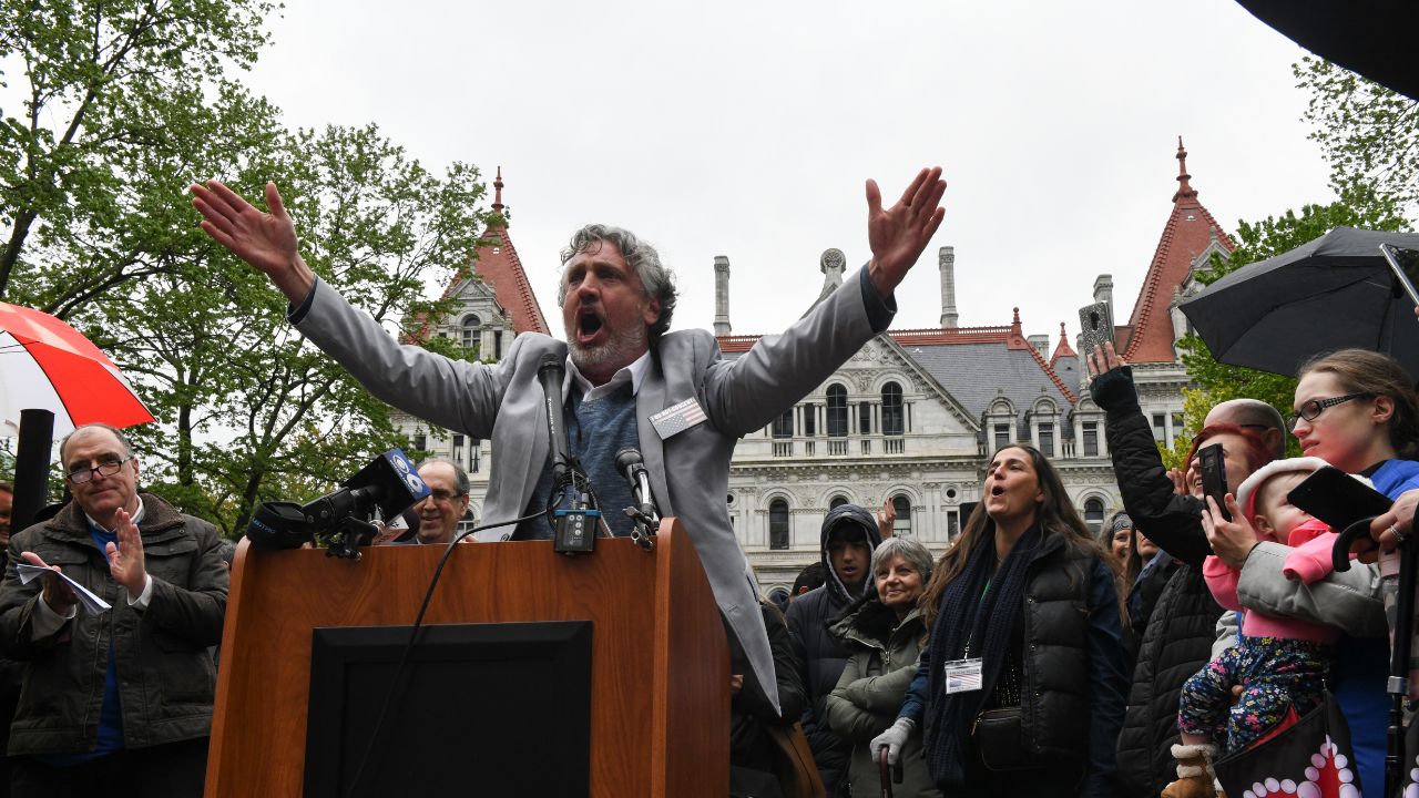 Del Bigtree, founder of the Informed Consent Action Network, during an anti-vaccine rally outside the New York State Capitol in 2019 in Albany on May 14, 2019. Bigtree is Robert F. Kennedy’s Kennedy’s former campaign communications director. (Desiree Rios/The New York Times)