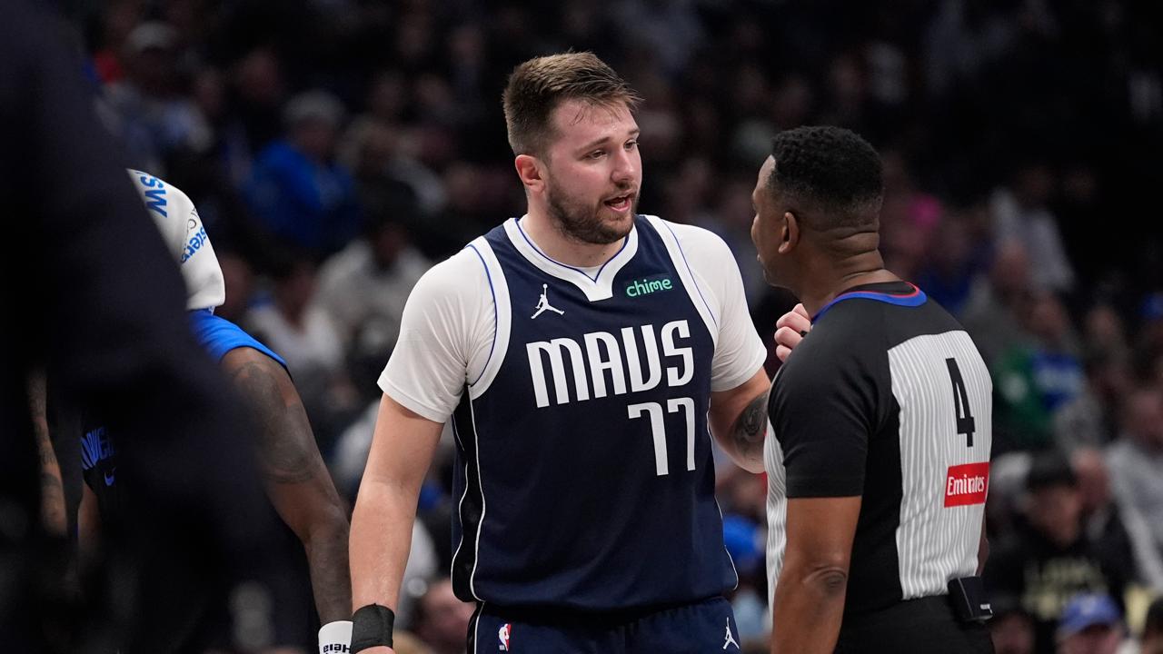 Dallas Mavericks guard Luka Doncic (77) questions a call by referee Sean Wright (4) during the first half of an NBA basketball game against the Portland Trail Blazers, Monday, Dec. 23, 2024, in Dallas. (AP/LM Otero)