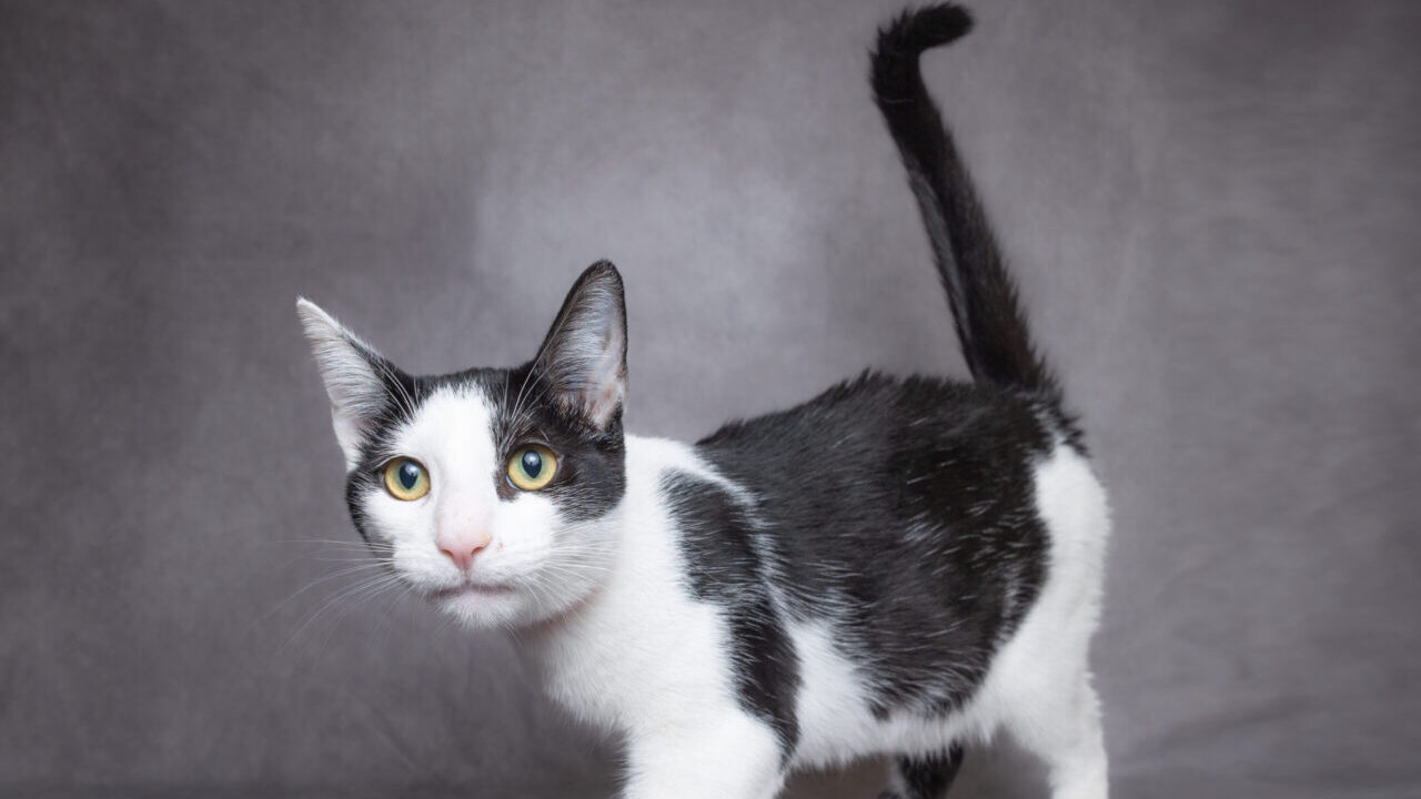 A pert little face, with its impish pink smile and beautiful black-on-ivory markings, is the perfect complement to her sleek, polished suit of black and ivory silkiness.
