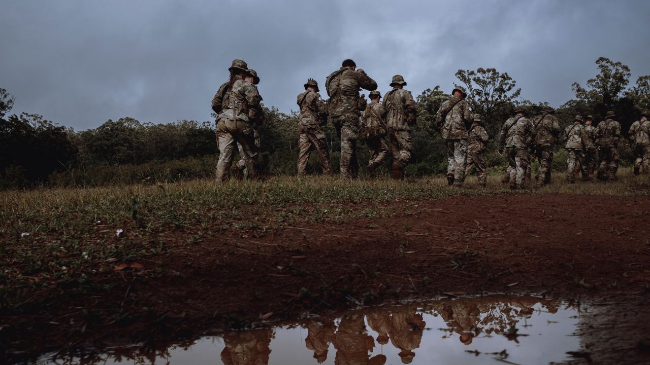 Soldiers at the Army’s jungle training school on Oahu, in Hawaii, practice tactical movements in the pouring rain, Nov. 28, 2023. (Mark Abramson/The New York Times)