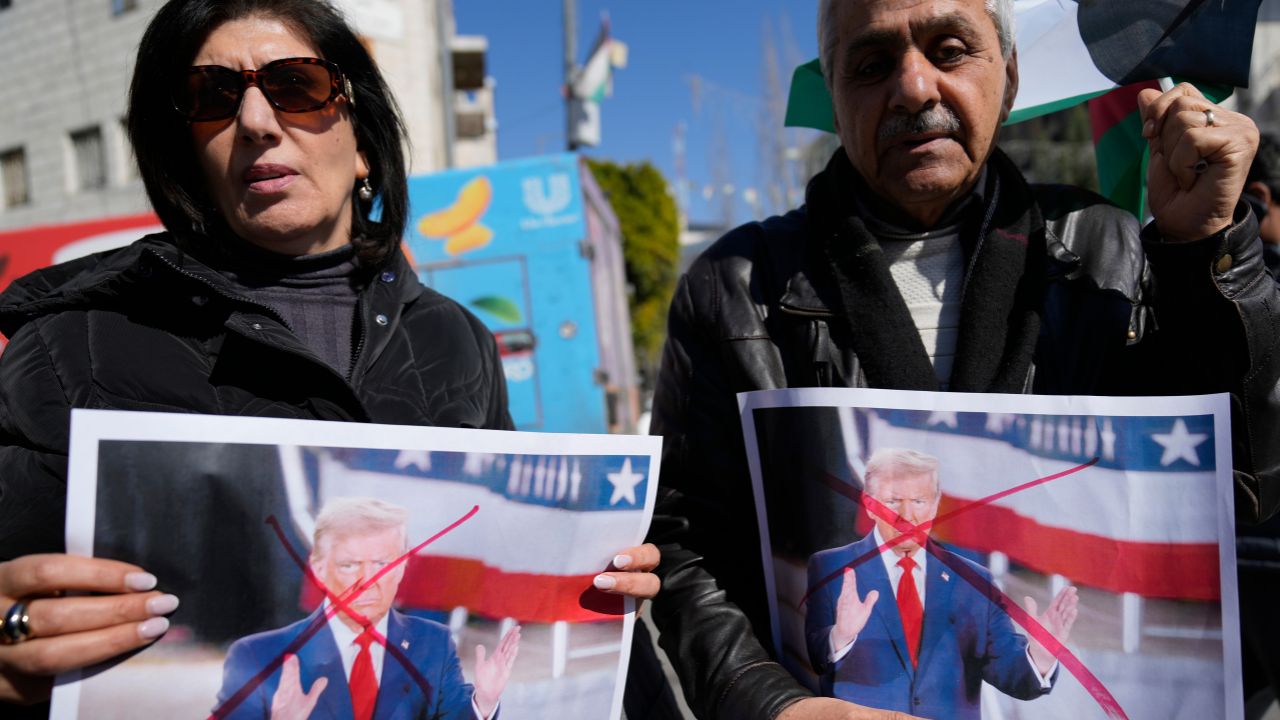Palestinians carry defaced pictures of U.S. President Donald Trump while protesting against his latest statements regarding the transfer of Palestinians from Gaza, in the West Bank city of Ramallah Wednesday, Jan. 29, 2025. (AP/Nasser Nasser)