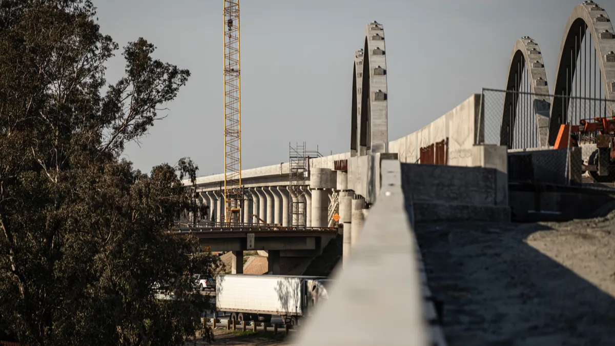 Construction on the High-Speed Rail over a ramp above Highway 99 in south Fresno, March 3, 2023. (CalMatters//CatchLight Local/Larry Valenzuela)