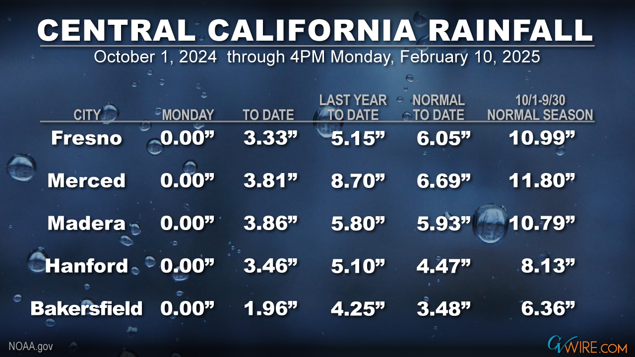 Fresno’s seasonal rainfall stands at 3.33 inches to date, or 55% of normal.