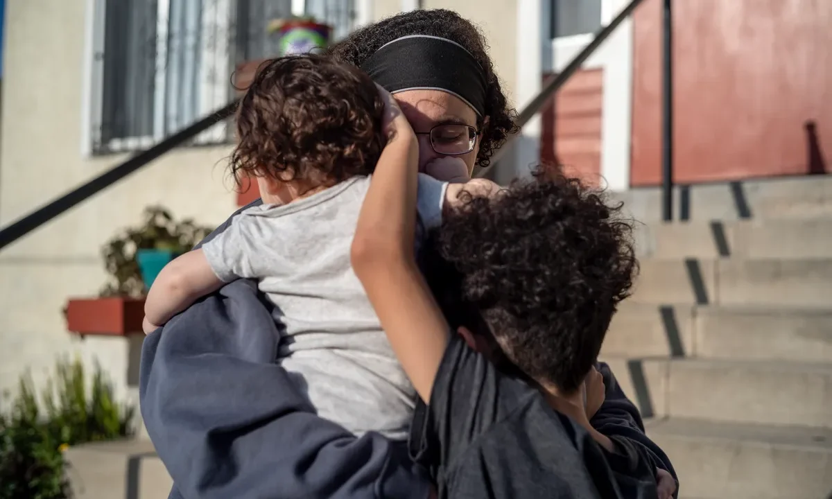Loreal Duran with her children, ages one and seven, in front of her apartment complex in Los Angeles, Feb. 8, 2025. Loreal’s husband, Giovanni Duran, was born in El Salvador and detained by U.S. Immigration and Customs Enforcement agents in late January. He is still being held. (CalMatters/Joel Angel Juarez)