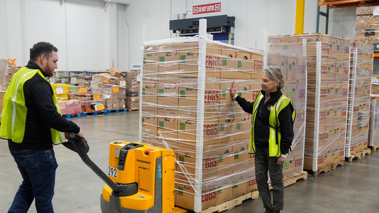 Rosemary Farm family representatives Jose Pelayo, left, and Lisa Stothart deliver a donation of hundreds of thousands of fresh eggs to feed first responders and those in need in the community through the donation of Rosemary Eggs at the Los Angeles Food Regional Bank in City of Industry, Calif., Wednesday, Feb. 12, 2025. (AP/Damian Dovarganes)