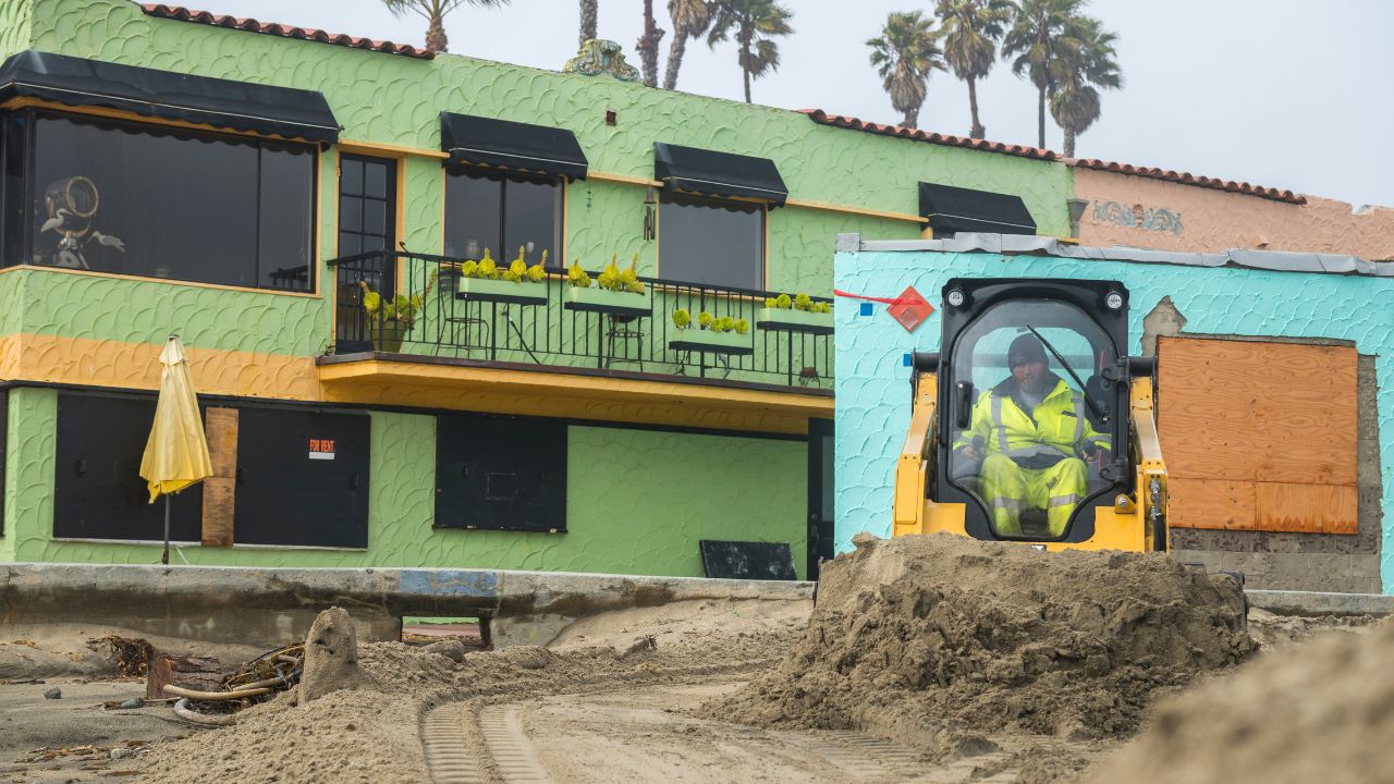 A public works employee builds sand berms to protect homes along the beach from expected storm surge in Capitola, Calif., Feb. 13, 2025. A large swath of California was bracing on Thursday for an intense bout of rain that could lead to flooding and cause debris flows in areas recently burned by wildfires. (Nic Coury/The New York Times)