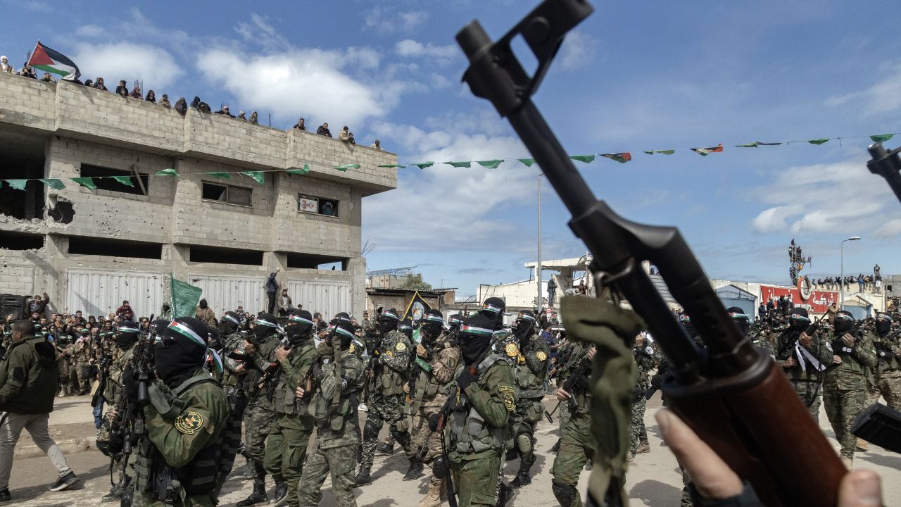 A show of force during a public hostage handover ceremony staged by Hamas in Nuseirat, in the central Gaza Strip, Feb. 22, 2025. U.S. and Hamas officials held talks in Qatar about hostages held in the Gaza Strip, breaking with a long-running American policy of refusing to directly engage with the militant group, according to an Israeli official and a diplomat briefed on the matter. (Saher Alghorra/The New York Times)