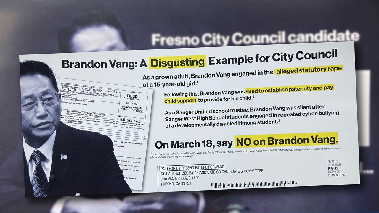 Last week, a group called Fresno Future Forward sent a mailer to residents in Fresno City Council District 5, which covers much of southeast Fresno. The mailer claimed candidate Brandon Vang — an elected member of the Sanger Unified school board — committed statutory rape of a 15-year old girl around 1993.