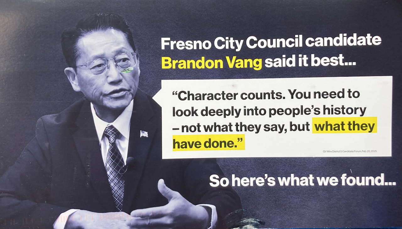 Last week, a group called Fresno Future Forward sent a mailer to residents in Fresno City Council District 5, which covers much of southeast Fresno. The mailer claimed candidate Brandon Vang — an elected member of the Sanger Unified school board — committed statutory rape of a 15-year old girl around 1993.