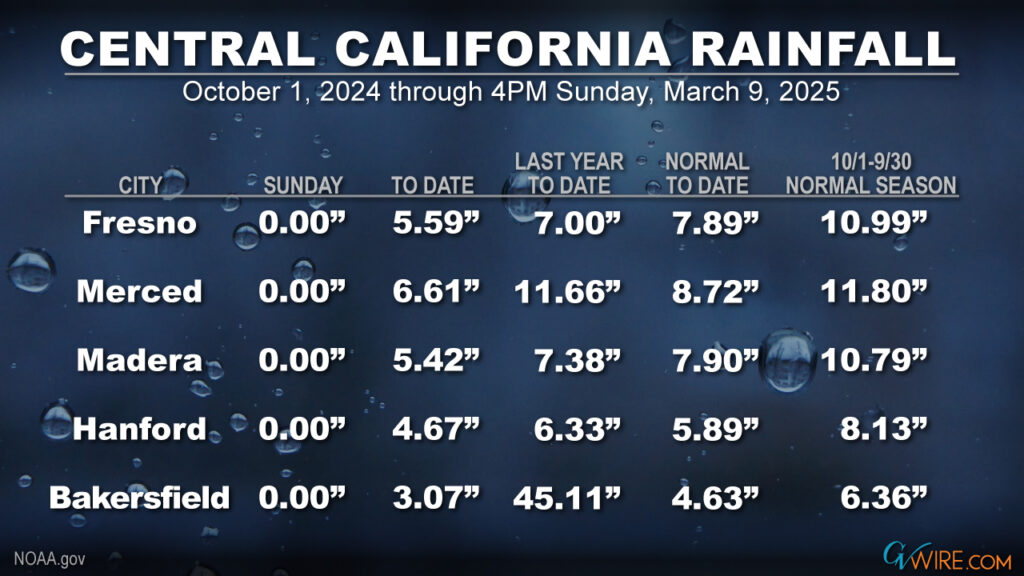 Meanwhile, the NWS Hanford forecast for Fresno has a 50% chance of rain late Wednesday morning and into the afternoon followed by a 100% chance that night with wind gusts up to 20 mph.