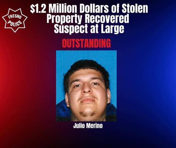 Fresno detectives recovered over $1.2 million in stolen property linked to multiple burglaries and are seeking help locating suspect Julio Merino, 25. (Fresno PD)