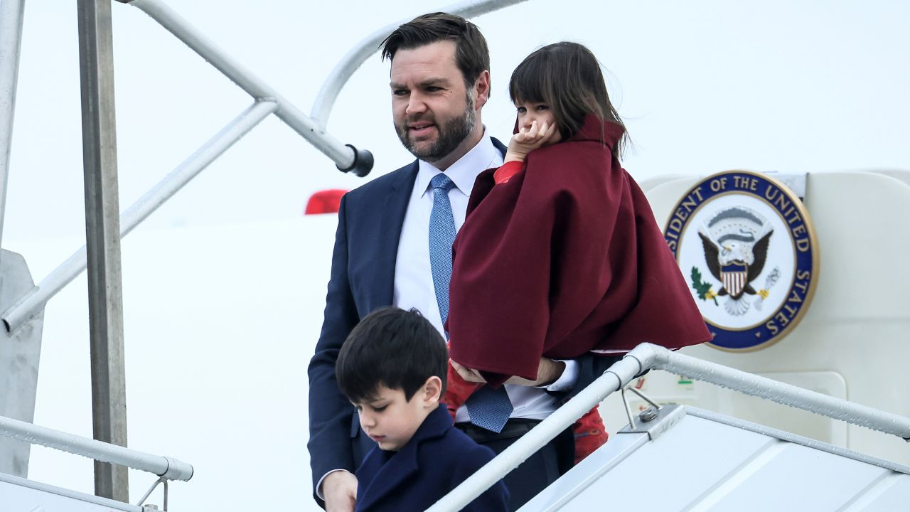United States Vice-President JD Vance, center, carries his daughter Mirabel as he arrives at Paris Orly Airport, ahead of an Artificial Intelligence Action Summit taking place in Paris, Monday, Feb. 10, 2025. (AP/Thomas Padilla)